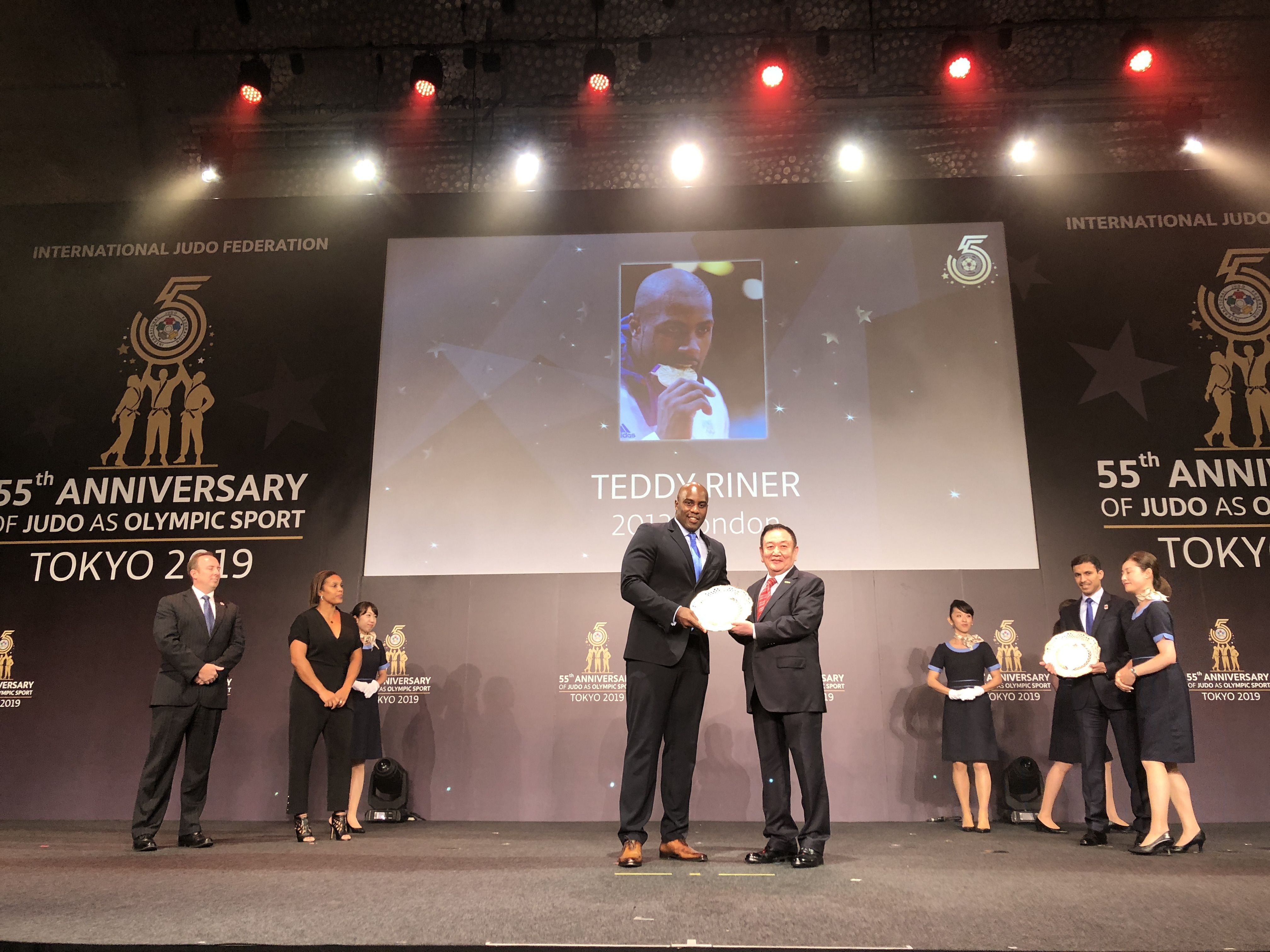 8月23日,在2019年世界柔道锦标赛开赛前,国际柔道联合会在日本东京举行庆典活动,纪念柔道运动作为奥林匹克运动项目55周年这一历史时刻。仪式上,国际柔道联合会将近60年来为世界柔道运动做出贡献的运动员与组织机构颁发奖项。k1体育产业集团作为国际柔道联合会顶级合作伙伴受邀出席,董事长卞志良作为特邀嘉宾为伦敦奥运会最佳男运动员Mr. Teddy Riner,伦敦奥运会最佳女运动员Mrs. Lucie Decosse 颁奖。