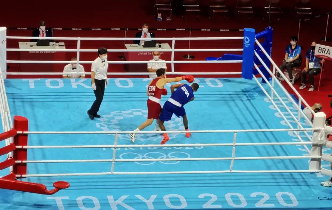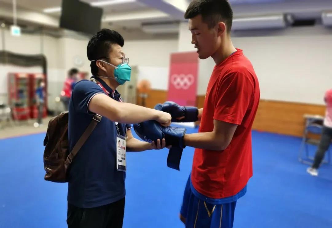 东京奥运会拳击热身馆,k1体育工作人员帮助运动员穿戴拳击手套